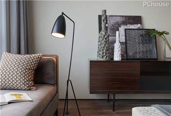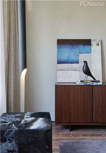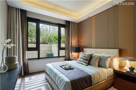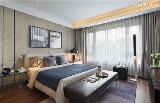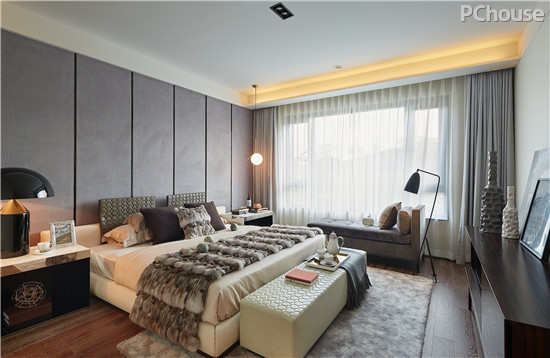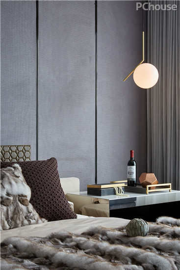 二楼主卧依然选择了灰色和米色的中性色调,用装饰品和灯具来营造优雅的气氛。以深色抱枕和搭毯来点缀,用色彩和材质演绎出一种卓有个性的奢华气质。