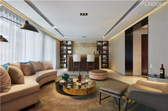 地下室的家庭活动室,设计师通过弧形的地毯,从家具的布局和摆放来分割两个空间,打破空间的呆板,营造轻松的家庭式氛围。