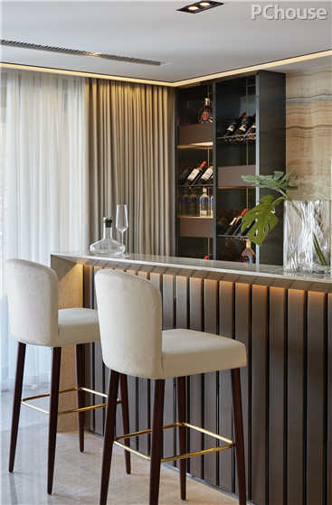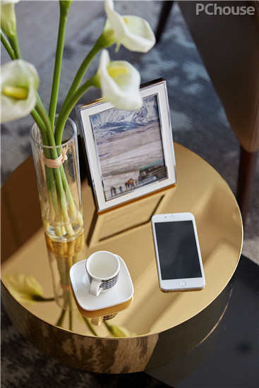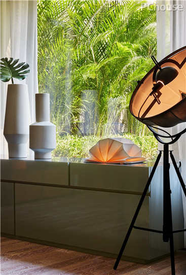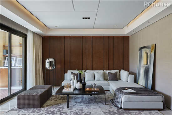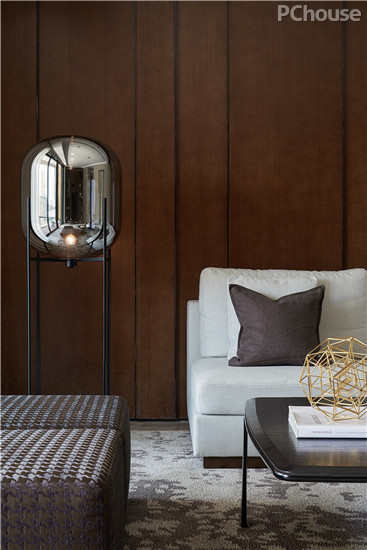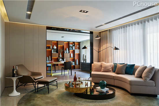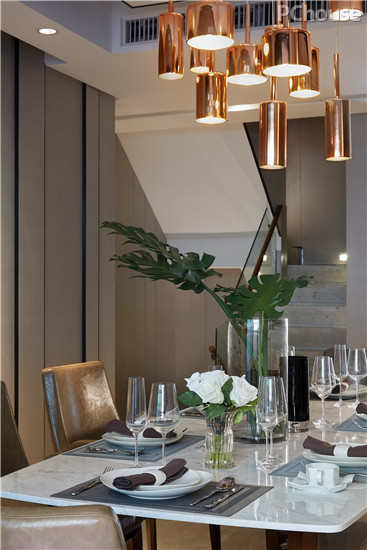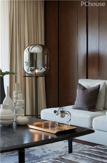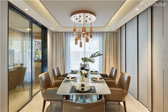 开间7米的横厅展现的是大方、直接的审美。客厅中选择体量与空间适应的沙发、桌椅等家具保证使用功能完善的同时,也让空间显得游刃有余。沙发背景饰以精致的凹凸线条,于细节中见品质。茶几上长短高低错落的饰品造成了视觉的轻盈感,多元化的混搭透出不拘一格的时尚气息。
