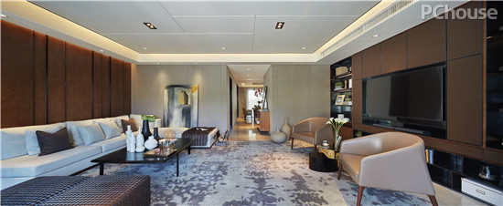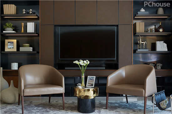 设计采用沉稳的木饰背景,与精心搭配的家居相互呼应,每个空间风格统一,连贯一体。大小分割的线条和韵律在空间中展开,墙体竖线分割,呈现立体层次。电视的摆放结合收纳及展示柜,美观、整齐而又实用。客厅在装饰材质的应用上也是相互呼应的,视觉上用深色背景配浅色家居,整体尽显和谐。