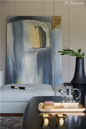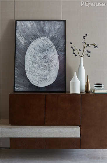 入口玄关将动线分散,风别通往客厅与餐厅。抽象的艺术画是整个空间的视觉焦点,画作赋予空间独特的艺术气质,带来充满流动性的艺术美感。