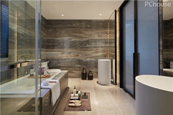 主卫是从布局上看,是两个台盆分开放置的设计理念,独立的柱盆,整面的落地镜,使整个空间通透宽阔。体现了户主的生活状态。在劳累一天后,可以在这里尽情放松,享受完全属于自己的时刻。