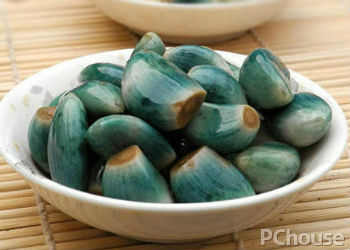 “腊八蒜”的绿色素实际上是由一种先生成的蓝色素和一种后生成的黄色素组成。一般在腌渍3天左右蒜瓣就慢慢的变成蓝色,但这时候蒜瓣还有辛辣的味道,等10天左右颜色变绿以后蒜瓣就没有辛辣的味道了,这时候的蒜瓣是酸甜清香的味道。