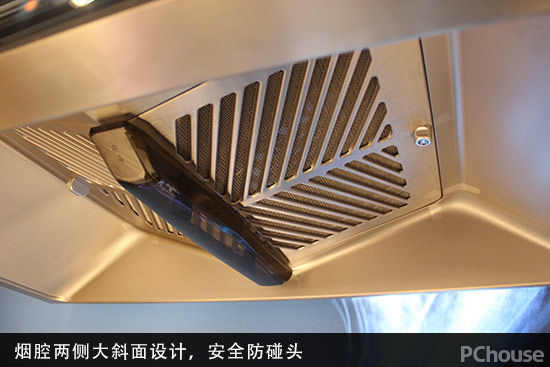 烟机内侧高度一般较矮,查看烟腔内部情况的时候,非常容易碰撞到头部。这款烟机内部两侧的大斜面设计,能防止磕碰,更加安全。