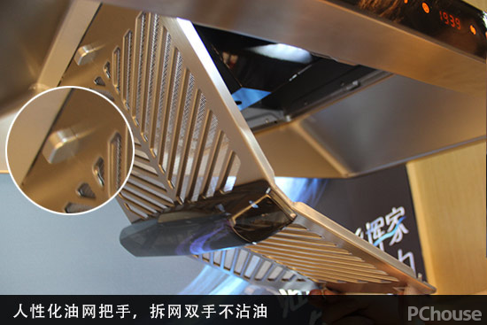 在拆卸油网的时候,一不小心就会弄到满手油污,用洗洁精都难以完全洗净。这款烟机在油网两端增添了油网把手,我们在拆卸油网的时候,小心捏住把手,就能避免油污弄脏双手,小设计相当人性化。