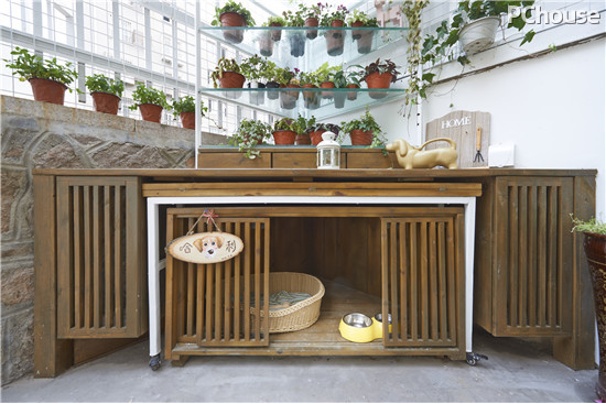 南面进门处即是花园绿树与舒适的木质平台,豁然开朗。院中为小狗哈利设计的狗窝,十分暖心;特别设置的洗衣台,便于洗晒。