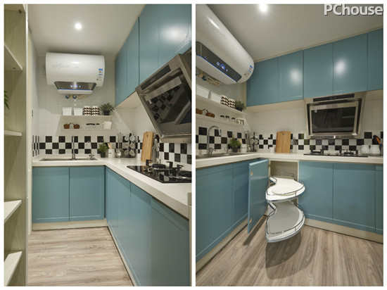 餐厨空间采用蓝白色调搭配纹理清晰的木地板,使容易油腻的厨房给人以清爽干净的质感。