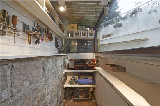 父亲的工作间也采用万用槽板进行杂物收纳。利用原本防潮洞改造的工作间,不仅高度舒适,便于储纳,还设计了可变化的透光百叶顶棚。