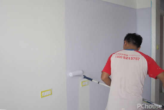 除了滚涂的方式以外,对于墙面的边角位置,师傅细心地用刷子涂刷,确保墙面的边角都能涂刷到位。