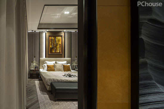 设计说明:主人房卧区和休闲区以玻璃趟门分隔,优雅大气的傢具饰品、啡色扪皮床背墙与特色玻璃屏风,为卧区营造出高贵时尚的感觉。
