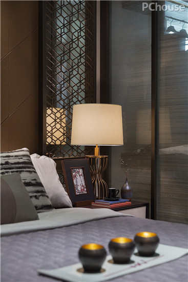主人房包含书房与卧房。由通道连接两个区域,工作休息互不干涉。设计师将东方美学用现代手法巧妙应用到空间中。