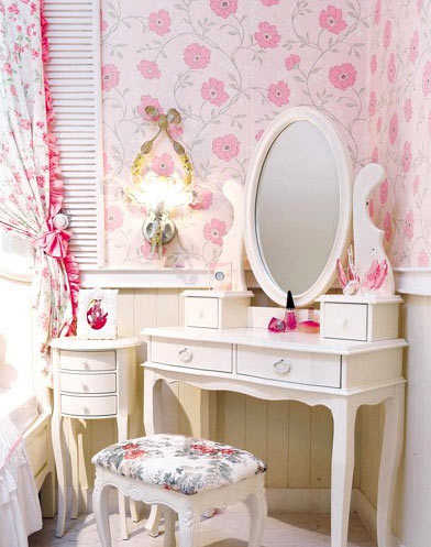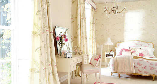 整个卧室以白色沉底,清浅的粉色与白色搭配非常漂亮,家具也大都采用白色,令房间更整洁,不至于凌乱;搭配上条纹及精致的水晶吊灯,立刻营造出一个明亮的法式田园风格卧室。地毯是粉色,与床品上的蝴蝶图案为同一色系,增加房间的柔美。由于壁纸和窗帘全是花朵图案,所以天花板和地板就采用了白色,否则会使房间显得低。