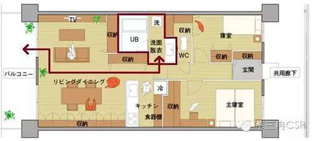 我们看到日本的很多房子,在从玄关进入房间的过程中会先穿过洗手间、浴室、收纳室等功能性房间,最后才到达LDK(厨房、餐厅、起居室一体),这样做可以将功能性空间整合到一起,缩短做家务的动线。