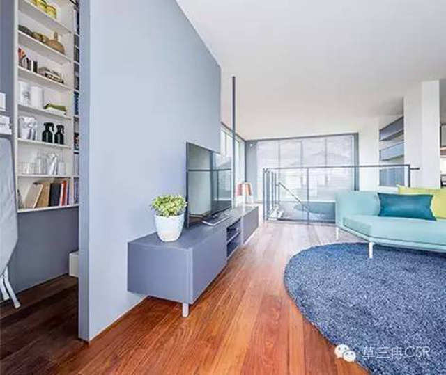 利用电视背景墙背后的狭长空间作为收纳和家务通道▼