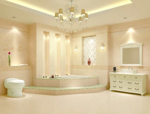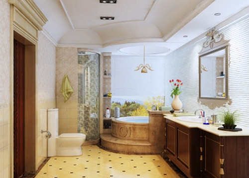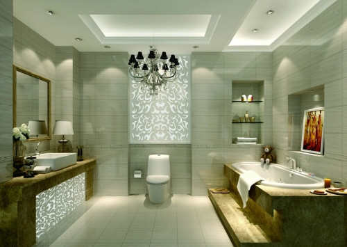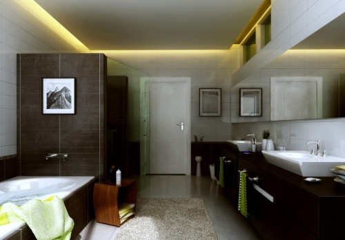 如果你想要浴室空间显得低调而沉稳,那么可以考虑在选择卫浴家具时偏深色系一些,比如深咖啡色就很不错。为了不让人感觉到压抑,也可以放弃传统的吊灯或吸顶灯,而选择房顶的隐藏光源来提供照明。