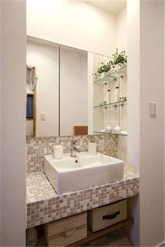 用玻璃板打造收纳空间,明净易打理。把洗漱部分安排在卫浴间门外凹陷的空隙,使得卫浴间自身的空间得到释放,同时,可以通过透明的玻璃板打造一个小收纳空间,将各种洗漱用品整齐的摆放在上面,方便拿取。结合洗漱台下面的木质小收纳盒,将要清洗的衣物等物品放在里面,增加了整体的收纳功能,减少卫浴间内因为收纳空间的占用而产生的压抑感。