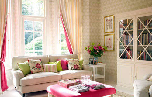 红色系是婚房中惯用的色彩,选用粉红色的沙发和红色花朵图案的窗帘,是这个空间呈现了优雅浪漫的情调。铁艺的玻璃茶几,线条优美。