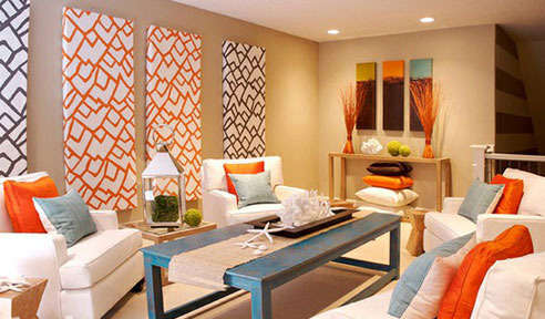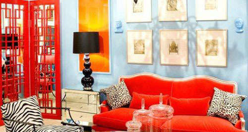 用橙黄色代替大红色,也能将客厅布置的十分喜庆,橙黄色的沙发搭配斑马纹的抱枕和座椅,使这个客厅显得时尚。一旁的屏风则带来了中式的风情。