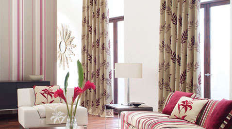 暗红色的条纹沙发和同色系的条纹墙纸,相映成趣,条纹墙纸能起到拉伸空间的视觉效果。紫色的窗帘。更是给空间增添了高雅的格调。