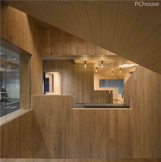 新的楼梯空间容纳了平台、内置座位和能够各角度捕捉到香港城市景观的开窗。如恩采用木盒子的概念重新诠释楼梯的空间形式,刻意避免过分强调维多利亚港的视野(很多香港的企业办公楼都看得到维多利亚港的景观),反而将更多的焦点放在办公室内的活动和其他角度的室外景观上。以木元素为主的楼梯空间内穿插着水磨石地面和铜制的扶栏,人们沿着楼梯行走,透过不同尺度的细分空间和开口,邂逅意料之外的视野。内嵌式的BARRISOL天花板为室内带来了自然光般柔和的照明。