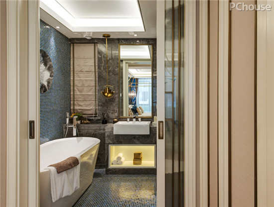设计说明:卫生间的布置,不仅具备现代生活的便利,还具有了清新雅致的线条美。
