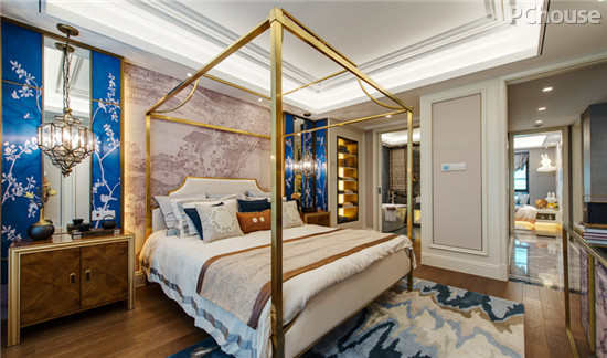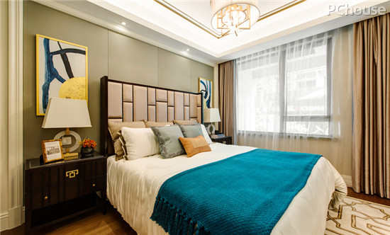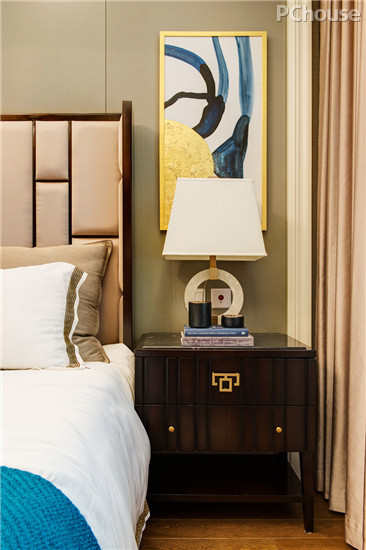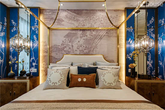 设计说明:移步到私密空间,主卧流线清晰。背景墙上的《清明上河图》和《花鸟》图案,彰显主人的品味与沉淀。偌大的飘窗将自然光线引入室内,闲暇时主人家亦可沏一壶香茗,在繁华里,静看繁华,于声色中,不动声色。光影交错中,设计师务求将东方神韵之精华融于其中,以造东方之境,成淡雅之家。