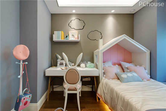 设计说明:女孩房以“米菲”为主题。在有限的空间里,设计师关照需求并精心提炼,利用飘窗的位置打造出了儿童房的睡觉区域、书写区域和玩乐区域。色彩搭配上,以灰色墙纸为基调,搭衬以粉色色块的墙绘,追求童趣而又不失格调。