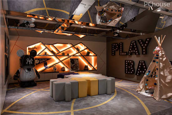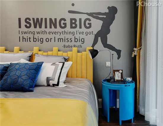 设计说明:对于男孩房的设计上,设计师投其所好,将“棒球”作为主题。大色块的对比,强烈的视觉冲击突显空间质感,灰色和黄色的碰撞激发出人们对男孩活力的想象。为了摆脱单调,天花上的走边和床头的手绘,令空间层次感尽显。