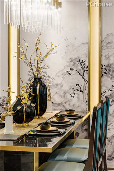 设计说明:随着整幅背景墙上的水墨山水,视线自然过渡到了餐厅。司空图《诗品·雄浑》云:超以象外,至大不可限制;得其环中,理之圆足混成无缺,如太极然。圆,寓意阖家团圆,是不可或缺的中式元素,以不同的具象再次映入眼帘。设计师化繁为简,餐桌椅则以更符合现代人审美的造型夺人眼球。在细节的把控上,花艺与饰品让中式韵味娓娓道来。