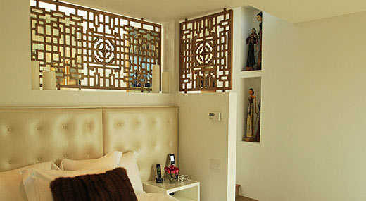 处于下沉位置的小卧室,一旁的几阶小楼梯与床头后方位置巧用小墙体作隔断。告别了生硬的白墙,而是将顶端三分之一处设计为窗棂,绝美的雕刻,雅致的用色,极具古典美,大大提升了整个卧室区域的品质。