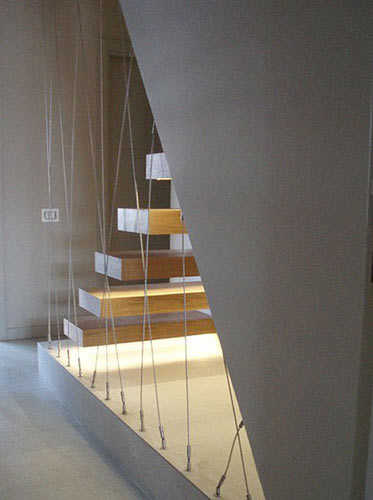 极简风格的室内装修,以水泥面、木质楼梯,还原家最真实的面貌。厚实木板所做成的悬挂式楼梯,让上下的行走有些不安,而简单几根拉伸所打造而成的隔断,轻轻松松捎来一份安全感。