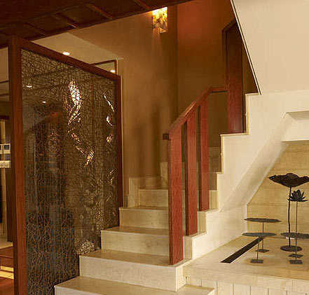 深色的木材、幽暗的光线、一旁的荷花雕塑,整个空间充满了带有禅意的东南亚风情。楼梯间的隔断是一堵玻璃墙,玻璃边缘采用与扶手相同的木色作为镶边,中间玻璃的作碎效果,在灯光照射下发出迷人的金色。
