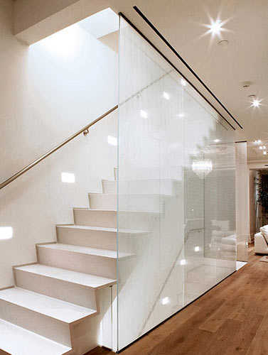 带有中间平台的玻璃楼梯,用一堵磨砂玻璃墙作为上下楼梯的隔断及庇护,靠近内侧的边缘贴心作了弧形处理,圆润的外延很好的避免了不留意的磕磕碰碰。