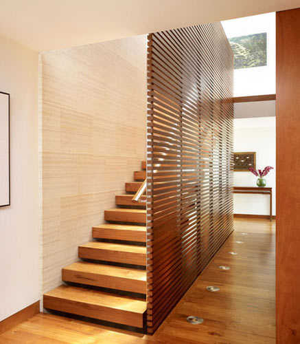 楼梯处的屏风有时是十分必要的配置,例如这款案例,它为楼梯间塑造了一面墙,为楼梯把手制造载点,而屏风的木质横条设计,为整个空间带来十足量的线条,让空间充满层次感。