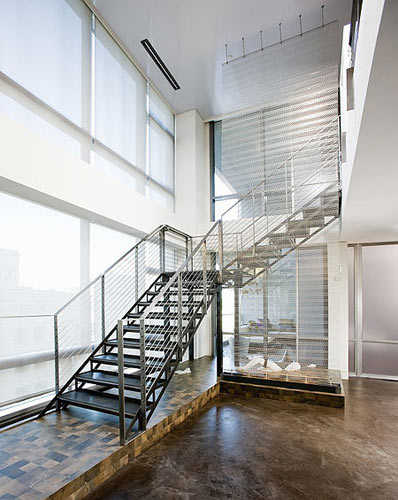 极具现代感的铁艺楼梯,楼梯转弯处高高的隔断若隐若现,是一块由细铁丝编织而成的铁帘,它更多的作用是作为空间的装饰,而最美的面貌是它在晚间的时刻……