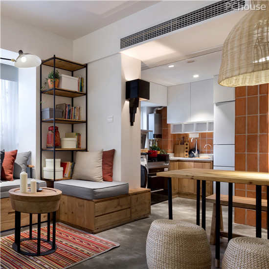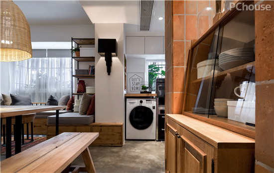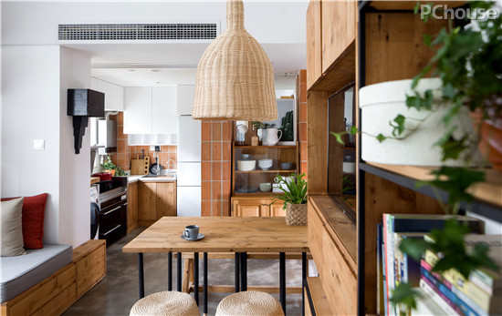 改造中少不了设计师DIY制作的家居用品。赖旭东尽其所能DIY,新风系统、墙砖、家具通通来了。设计师自制了木头灯、窗帘、抱枕等各种软装,还邀请四川美院的朋友制作特色地毯,送给小夫妻作为新婚礼物。