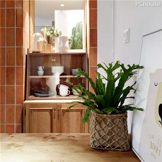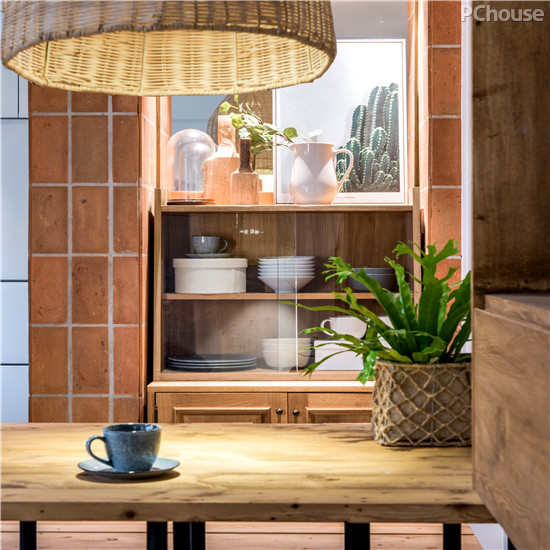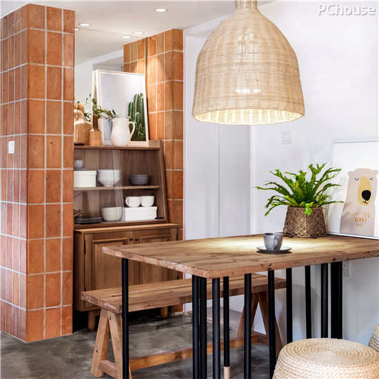 采用非常廉价的普通红砖切片打磨的方式,解决了墙面砖,既省钱又美观,材料费用仅合每平方米45元。
