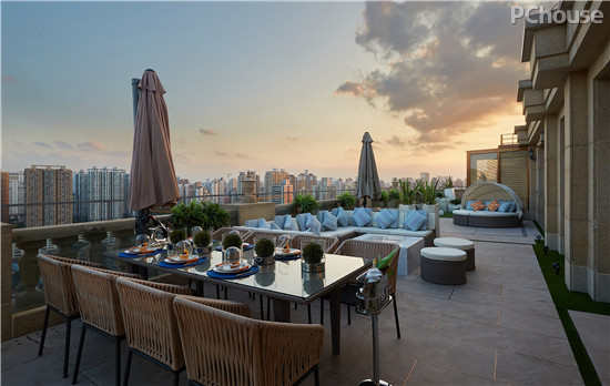 大面积的环形露台衔接每个空间。露台分布着餐区以及若干休闲区域,完全可以满足名流和精英们的各种聚会。在这里欣赏着上海滩的美丽景色,似乎可以忘记紧张的都市生活,只享受一份惬意与悠然。