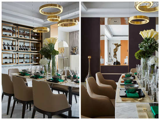 现代几何造型的圆形金色吊灯搭配色彩如祖母绿般耀眼的餐具配饰,让这个餐厅空间闪耀着国际都会奢华摩登的醉人魔力。