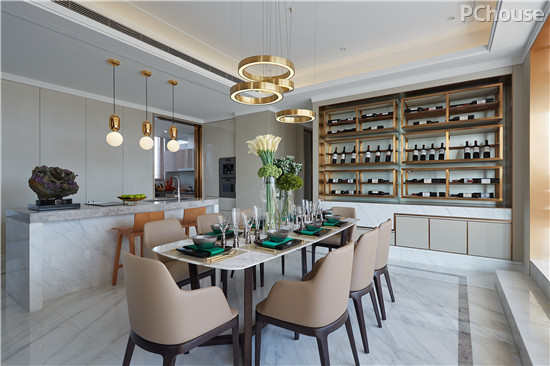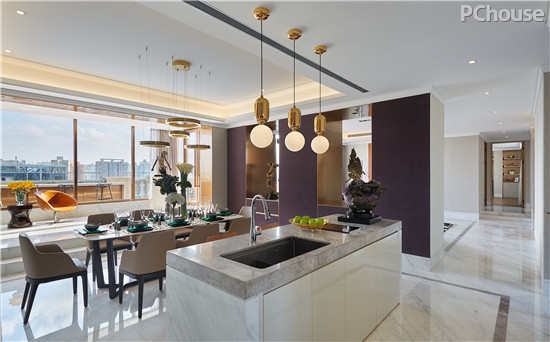 餐厅和厨房由西厨吧台连接,吧台与家庭厅、餐厅及中厨形成强有力的互动关系,将外滩美景尽收眼底。