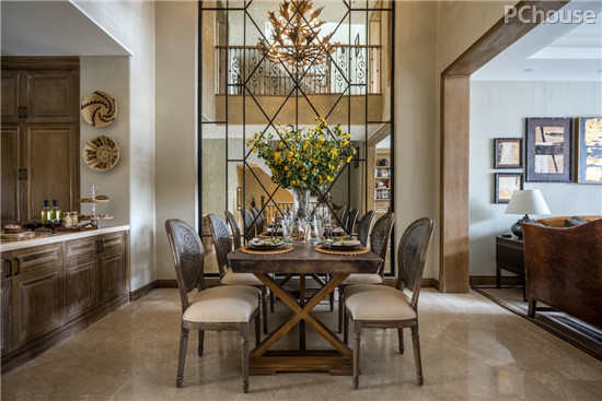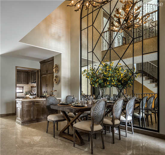 设计说明:粗犷的做旧家具,透出浓浓的原始部落风情,开放式+挑高+镜面设计,就餐空间瞬间扩大。镜子不再一味的光滑,而是强调线条在其中的融入之美,吊灯呼应主题,鹿角元素再现。