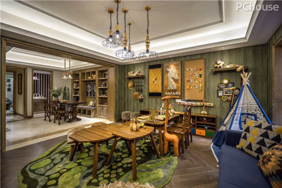 设计说明:儿童游乐区采用带点活跃的绿色和橙黄色,混杂着长颈鹿、狮子及各种野生动物造型,不仅呼应了主题,还能让孩子寓学于乐;就连小矮凳也被套上豹纹外套,细节处都渗透着主题风格。