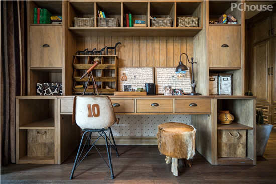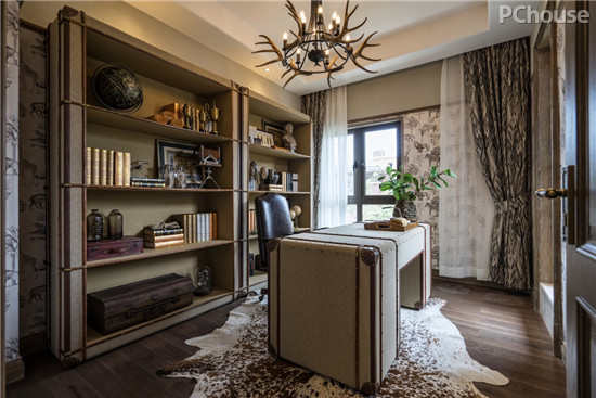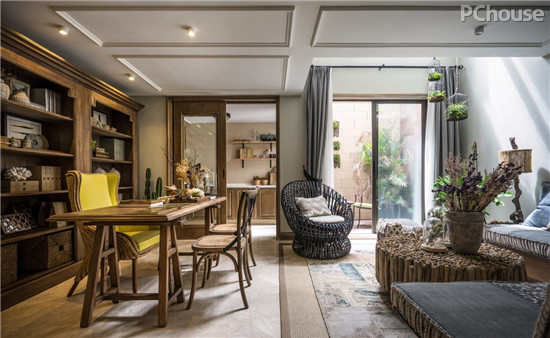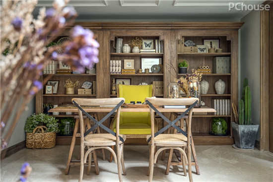 设计说明:书房做旧的家具给人平和、舒适的感觉,耐人寻味;棉麻、绿植等细节装点,明亮质朴,恰到好处地点缀。