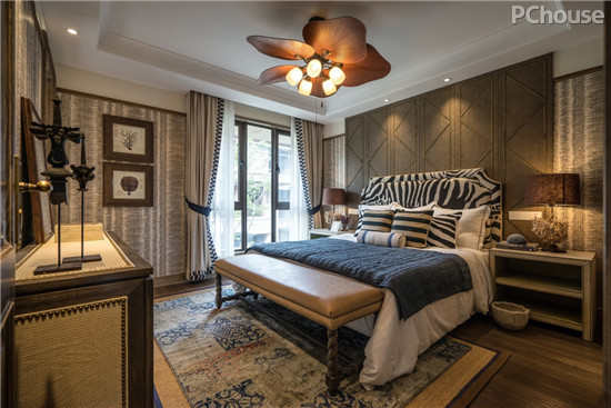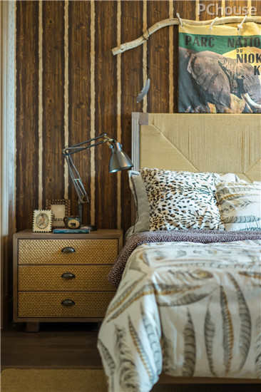 设计说明:儿童房采用双床设计,各自有独立的睡眠空间,继续以木纹做为背景墙,外加毛皮和原木等元素,尽最大可能还原并呈现出美式风情的主题。