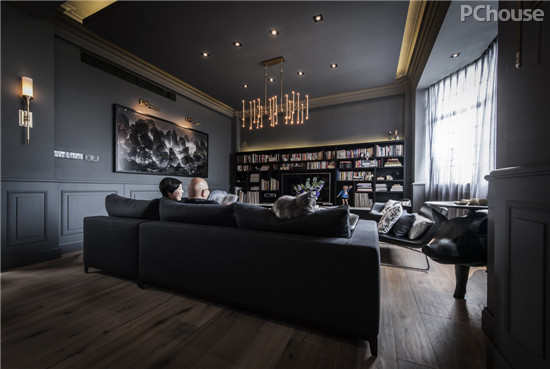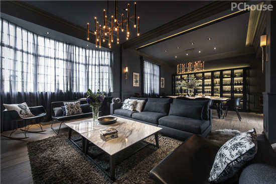 原建筑的铁艺窗户完美地成为背景衬托着Eames的躺椅及Moooi的黑猪边桌,欧式的古典护墙板与现代吊灯并置共存。