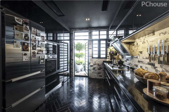 法式餐桌与HAY的餐椅完美搭配,做旧的大理石表面与高科技的现代厨具互相映衬,复古的铜质灯具与时尚的暗灰色调产生强烈冲击。