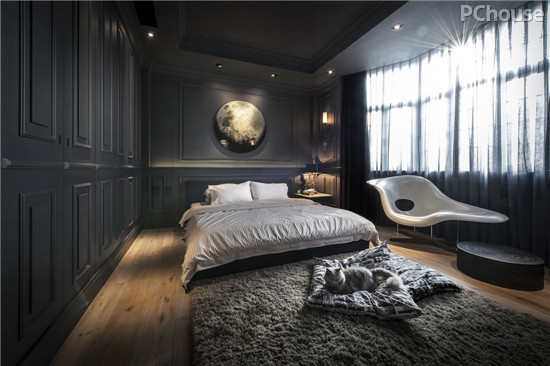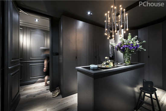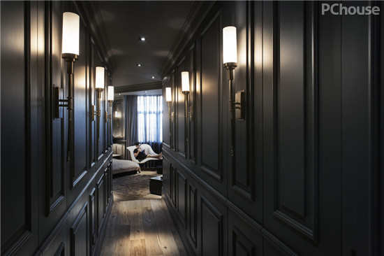 设计师设计了一条长走廊以区分相对开放的公共区域及私蜜的休息区域,并将休息区套间的浴室及更衣室门做暗门处理,以便不打断长走廊的空间延续性,同时保证布置在最远端的主卧到入口区域保持绝对的隐私。