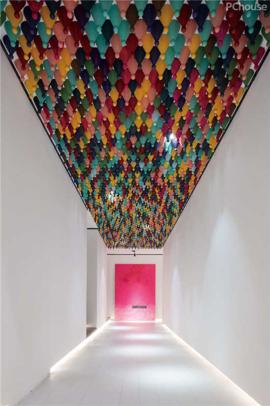 傍晚,可以来到酒店的咖啡厅来享受悠闲时光,天花上7只小人携降落伞从天而降。如果选择拥抱世界的姿势,飞翔的姿态最为优美,设计师以为。
