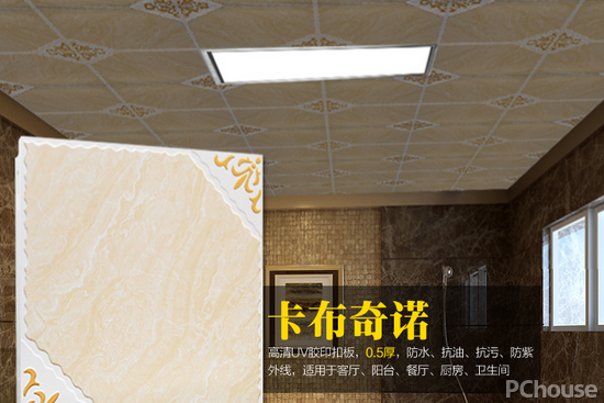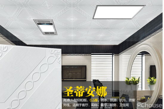 2.安装扣板。先将扣板四边的膜掀起,按照膜上的箭头同方向安装。第一排扣板安装一般要用美工刀做切割,要注意美观和对称,切割口对着墙面。