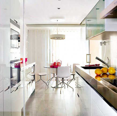一字型布局简洁、小巧,是空间狭窄厨房的不二之选。T型布局对面积要求也不高,又可融一字型和岛型的优点于一身,大有集大成者之势。此种布局可以清晰的将清洗区和烹调区分隔开来,而且还可以打造出一个简易的餐桌。